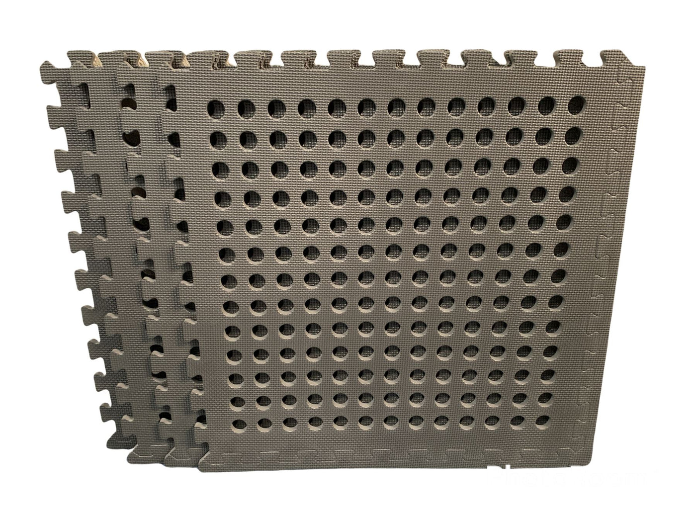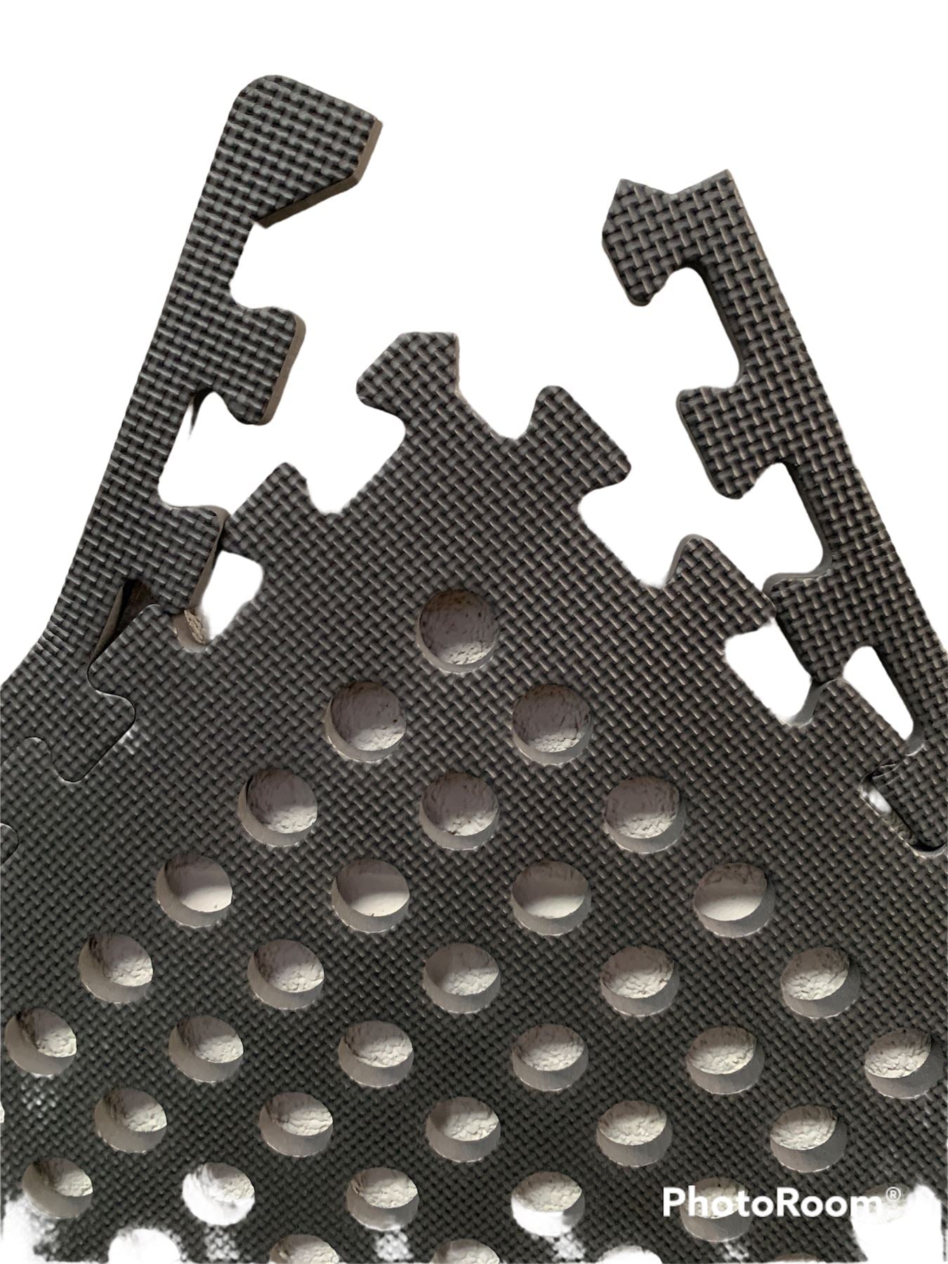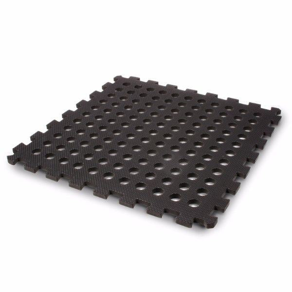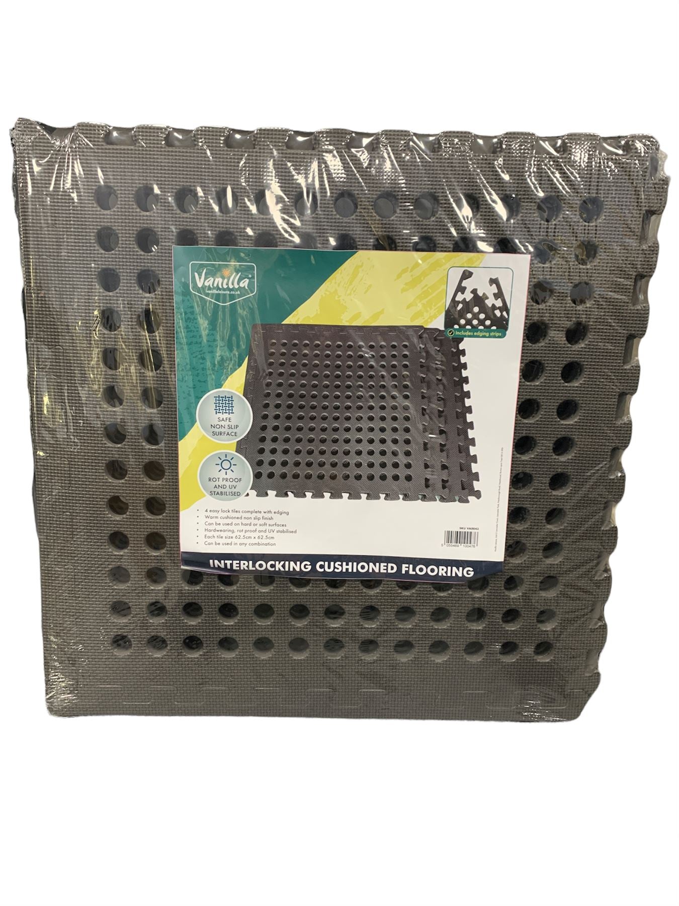 Interlocking Cushioned flooring - Universal, lightweight and versatile flooring for every occasion, these tiles are made from a high density foam to provide a warm, strong cushioned floor on any surface, ideal uses are Exercise Mats, Gyms, Wrestling, Schools, College, Play groups, Garage, Garden, Gazebo's, Caravan Awning, Camping, Concrete floors, Trade shows, exhibitions, Pool, Jacuzzi, Gravel or Hard Standing areas. These tiles are waterproof, rot proof and anti slip making them the ideal choice for all weather conditions. These tiles can be used on their own or can be added to if multiple packs are required to cover larger areas. Each tile has holes covering its full area to allow good air circulation so when used on grassed areas it will allow light and air to penetrate - perfect for Caravan/Camper van awnings. Each pack contains 4 tiles and 8 removable edging strips the tile size is 62.5 cm x 62.5 cm by 10 mm in depth.