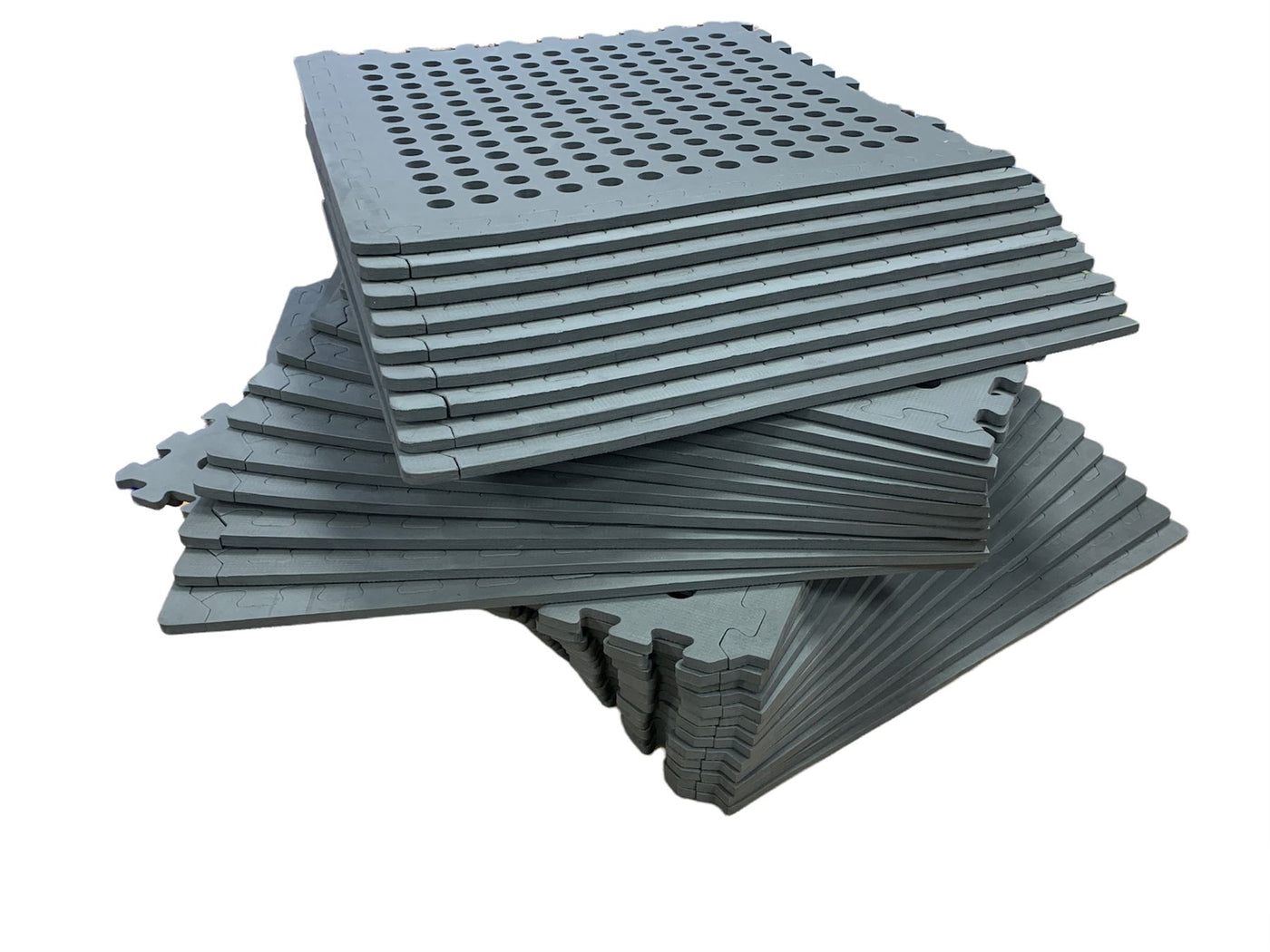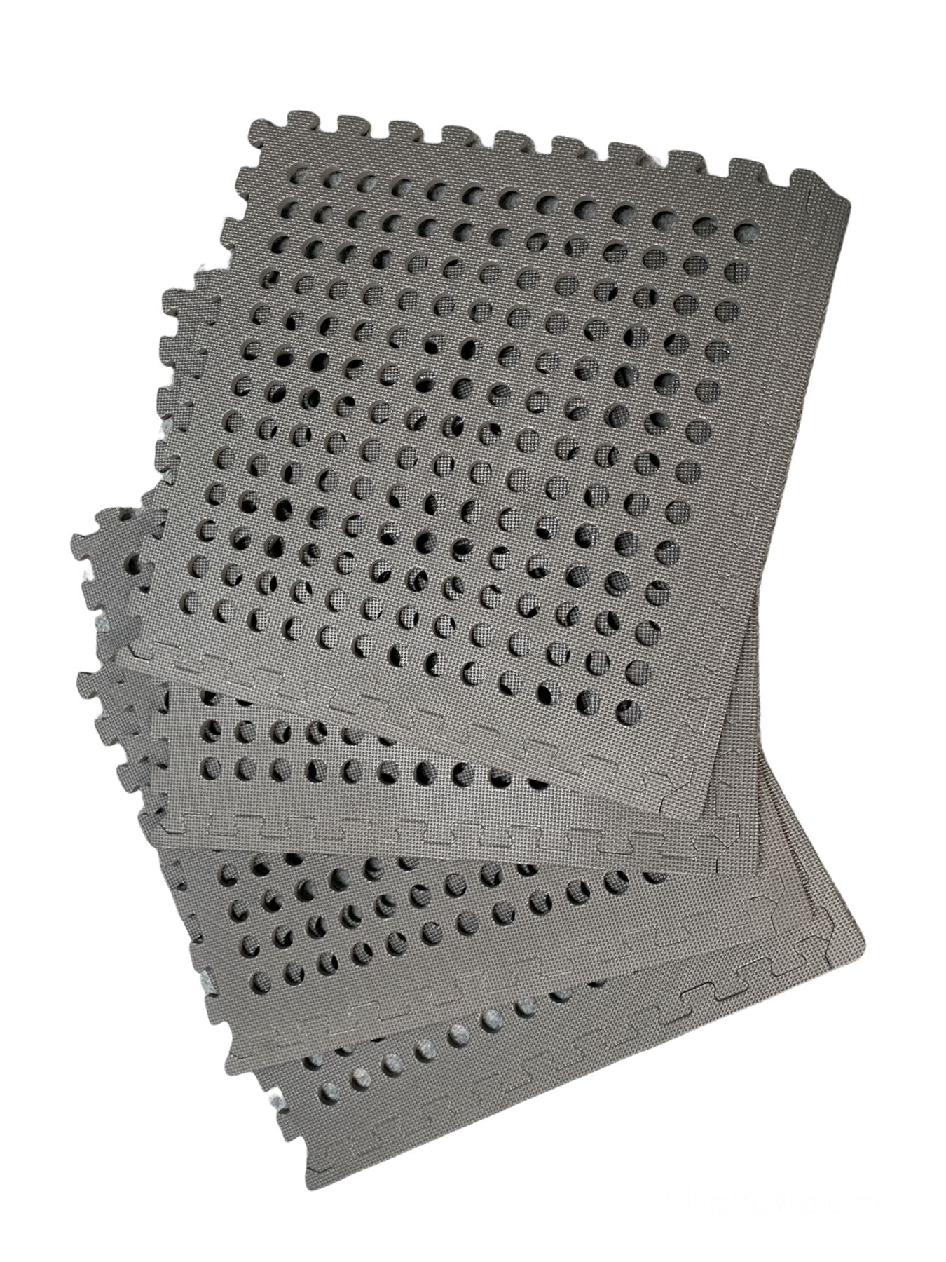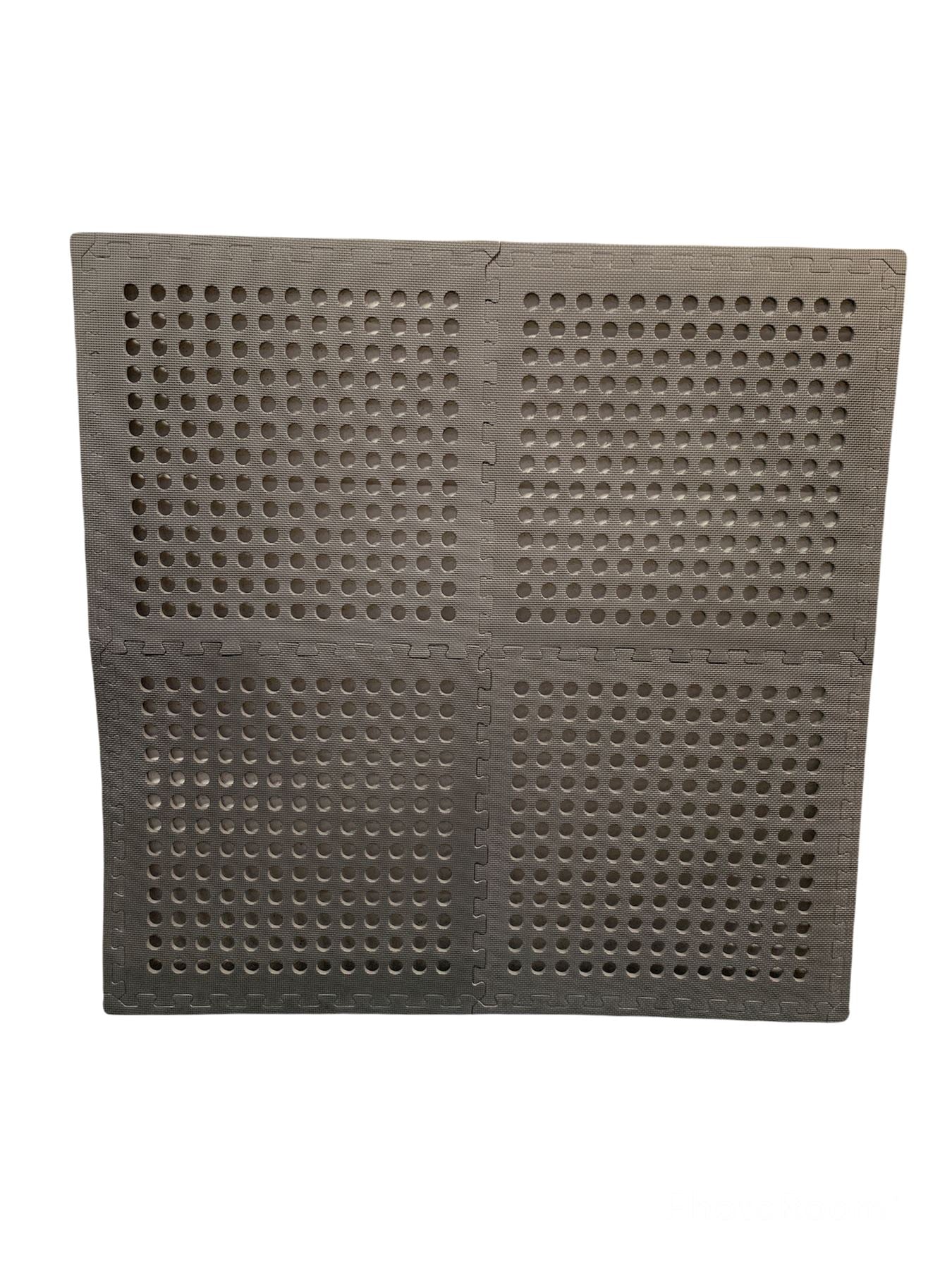 Interlocking Cushioned flooring - Universal, lightweight and versatile flooring for every occasion, these tiles are made from a high density foam to provide a warm, strong cushioned floor on any surface, ideal uses are Exercise Mats, Gyms, Wrestling, Schools, College, Play groups, Garage, Garden, Gazebo's, Caravan Awning, Camping, Concrete floors, Trade shows, exhibitions, Pool, Jacuzzi, Gravel or Hard Standing areas. These tiles are waterproof, rot proof and anti slip making them the ideal choice for all weather conditions. These tiles can be used on their own or can be added to if multiple packs are required to cover larger areas. Each tile has holes covering its full area to allow good air circulation so when used on grassed areas it will allow light and air to penetrate - perfect for Caravan/Camper van awnings. Each pack contains 4 tiles and 8 removable edging strips the tile size is 62.5 cm x 62.5 cm by 10 mm in depth.